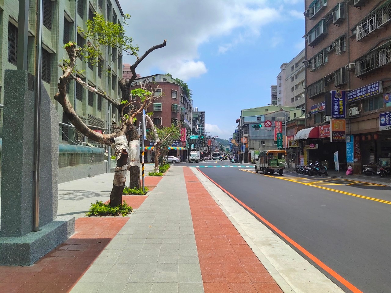 工務局長詹榮鋒說,通學廊道改善工程以人本為考量,包括設置符合規範無障礙通行道、將影響通行的燈桿及電箱等一併遷移至設施帶或是協調學校圍牆退縮,增加人行道空間等,形塑出整齊且便於步行的通行環境。